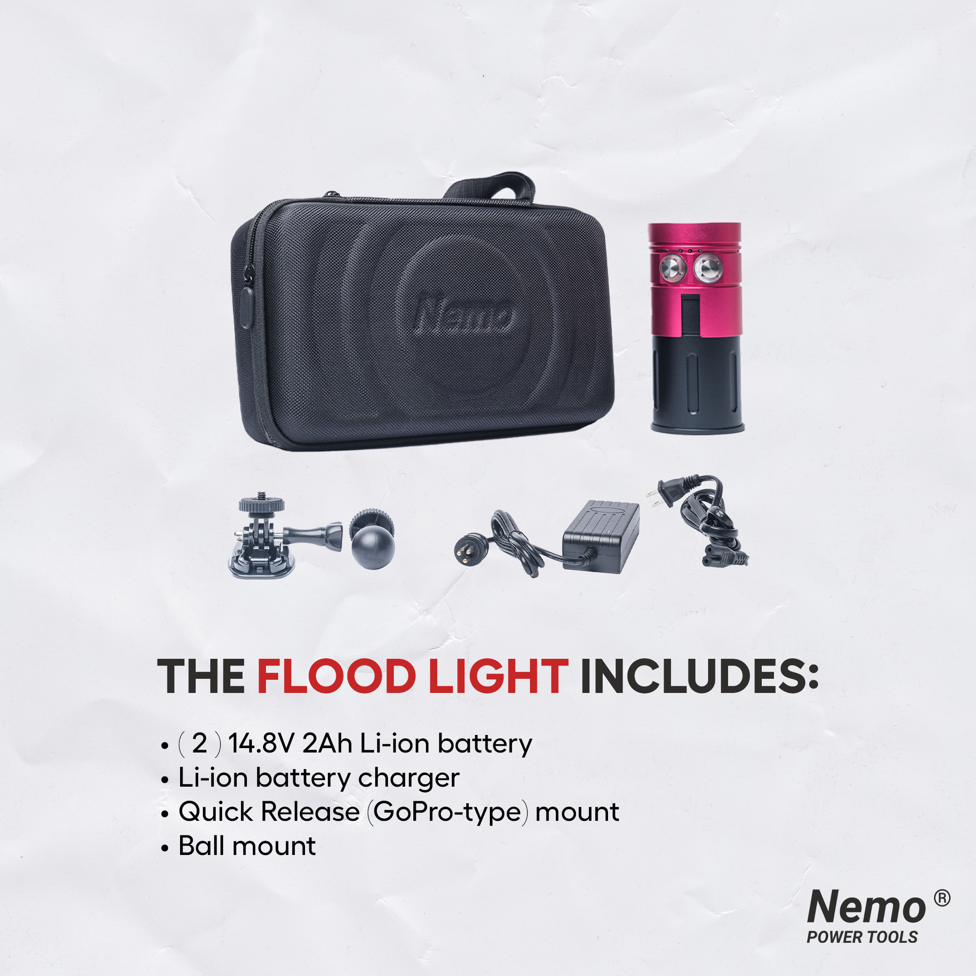 Accessoires : pack batterie Li-ion 14,8 V 2 Ah, chargeur de batterie, support GoPro, rotule (ball mount)